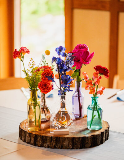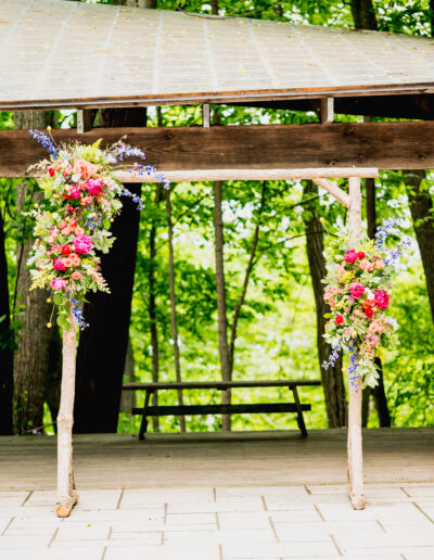 One of the simplest ways to reduce your wedding’s environmental impact is to focus on reducing the amount of new stuff you purchase. Single-use plastic items, décor, and favors can not only add to your budget, but are also likely to end up in the landfill. Renting décor items instead of buying new can ease some stress of transportation, set up, and clean up. We offer repurposed fallen trees from the property as rentable tree slices used for centerpiece bases and our ash tree ceremony arch. This gives these trees a new life as beautiful accents, all while easing the burden on you! We also offer fun rustic whiskey barrels available to rent instead of cocktail tables.