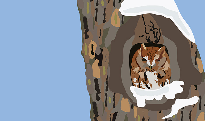 As dusk deepens, the screech owl awakens and begins hunting, gliding silently between trees. His feathers are designed to muffle sound, allowing him to approach unsuspecting prey. Mates keep in touch through even-pitched trills or “bounce songs,” and the male brings his mate a meal of small mammals, birds, or insects he captures. As a relatively small prey owl, he must stay alert as he moves through the woods, watching for larger owls that may pose a threat.