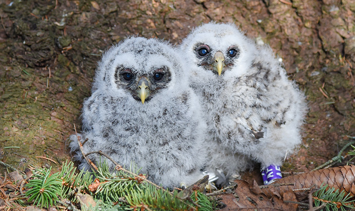 It’s also around this time when the research team carefully retrieves the owlets for measurements and banding. The data collected is essential for understanding the birds and their population over time. Each chick’s weight can inform the team if it’s a male or female (males are smaller while their sisters are bigger). Each receives its silver and purple bands, and then they are gently placed back into the box.