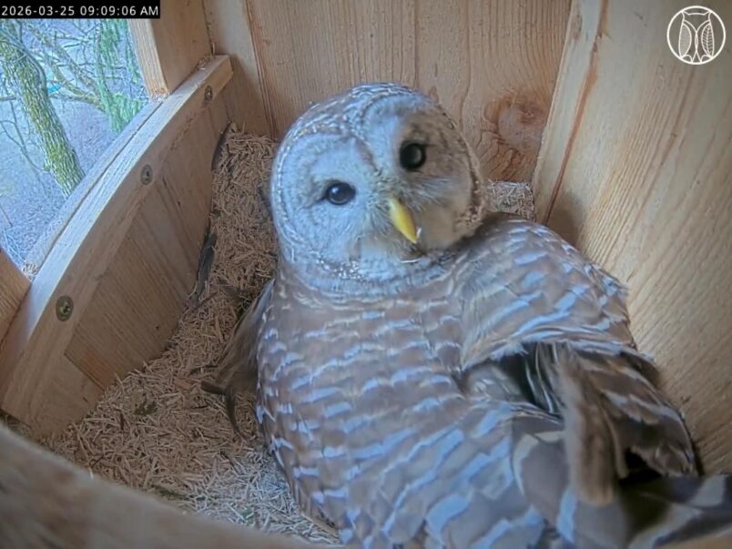 Barred Owl Nest Box Update: The 2026 nesting season has ended for Betty and Maverick. We’re grateful we were able share a glimpse into their lives with the public, no matter the outcome. Thank you for following along and we look forward to going live again in 2027! For more information about our ambassador owls, check out our Meet the Raptors page.