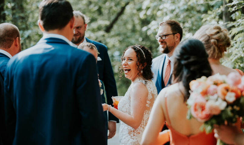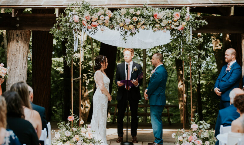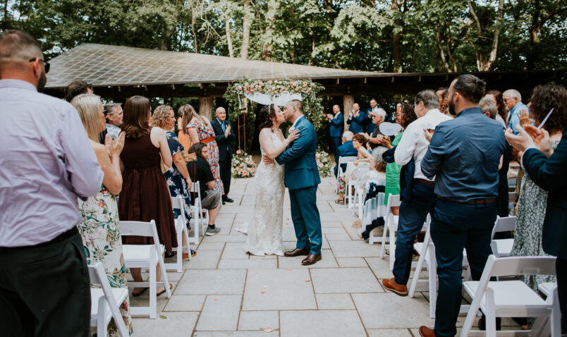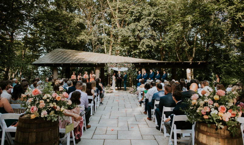 Mari and Nick’s summer wedding at Schlitz Audubon started in our two private dressing rooms. After getting ready and having a first look on the Ravine Deck, their marriage began with a picturesque ceremony at our Pavilion. Overlooking Lake Michigan, the Pavilion’s limestone courtyard creates a small sanctuary surrounded by trees in the woods. We can accommodate any traditions you hope to include in your special day. The couple rented two of our rustic wine barrels to mark either side of the aisle and topped them with beautiful blush floral arrangements. A chuppah draped with flowers and greenery stood at the east end of the courtyard, and live vocals and guitar filled the area with beautiful music.