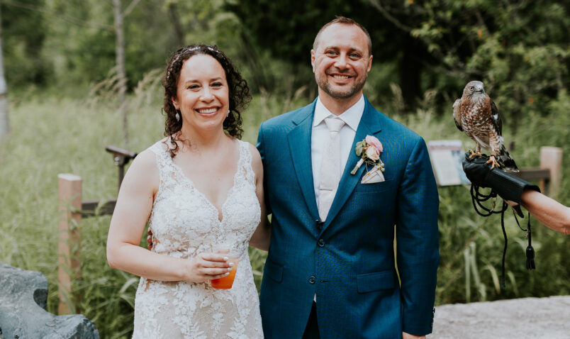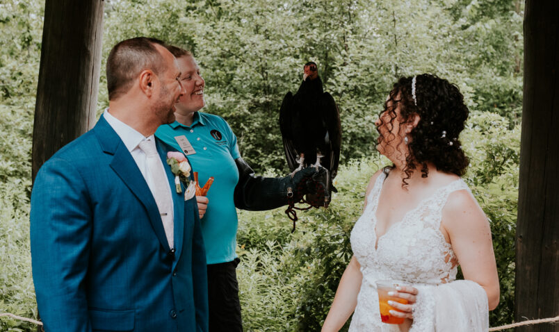 After the ceremony, guests were welcomed with a one-of-a-kind meet and greet with the Raptors of Schlitz Audubon and enjoyed cocktails and appetizers on our covered outdoor Veranda, followed by dinner inside our two-story beamed Great Hall. Our café string lights and up-lights illuminated the dining area and dance floor, giving off a warm glow. Tables showcased khaki-colored napkins, candles, and rosy florals. Dinner kicked off with a champagne toast to celebrate the newlyweds and included a wine pour with wines selected to complement their dinner. The couple sliced a chocolate cake and had different flavors of pie for dessert. The dance floor opened with the hora, a traditional circle dance, and the festivities continued throughout the night!